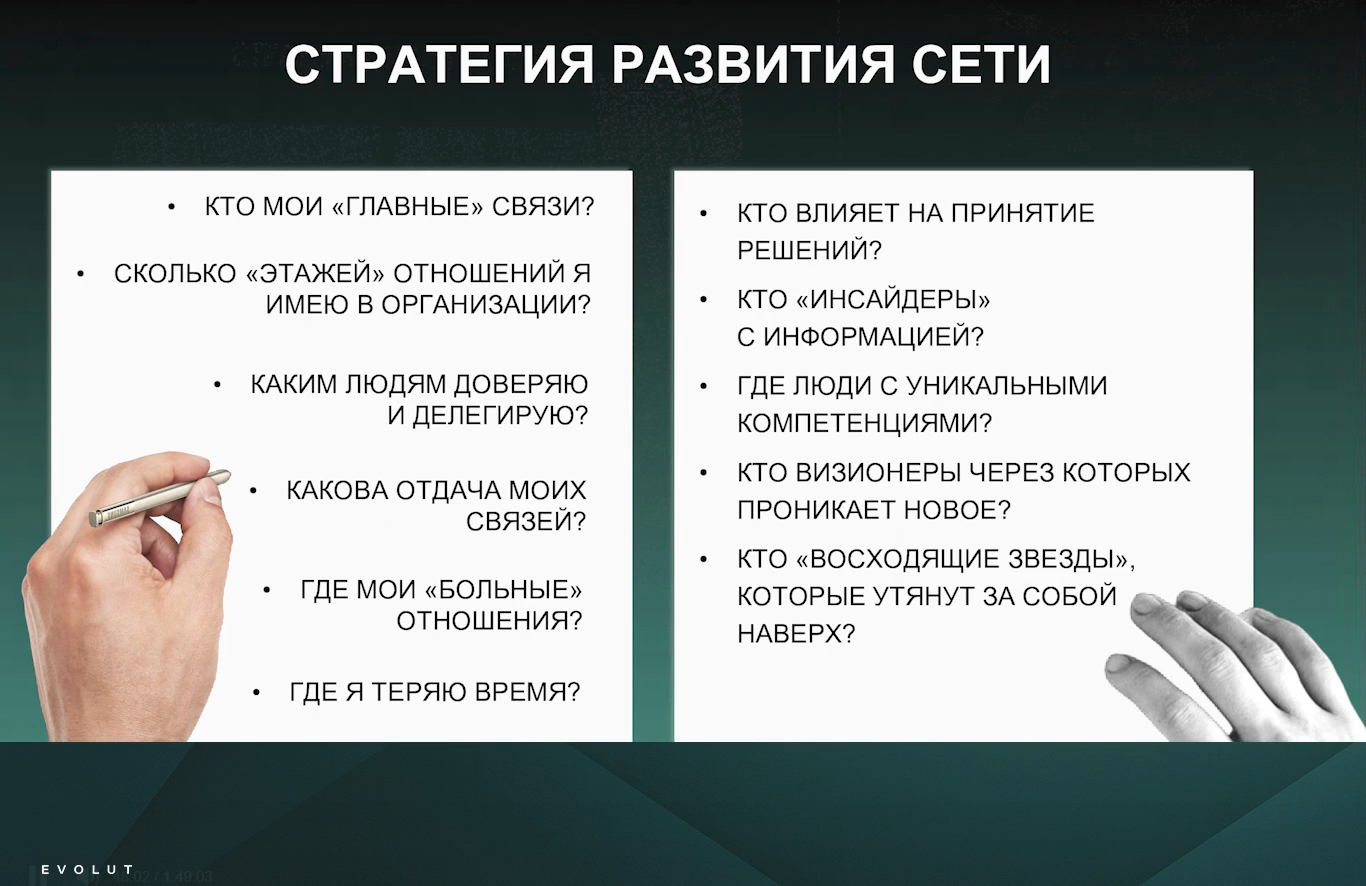 У разведчиков есть «правило 30 процентов»: человек, который не занимается осознанным развитием своей экосистемы, каждый год будет терять 30% своей сети контактов. С кем-то поругается, кто-то уедет в другой город, кто-то заведет семью. Поэтому, чтобы просто оставаться в окружении полезных контактов, нужно строить стратегию, соответствующую целям в бизнесе.